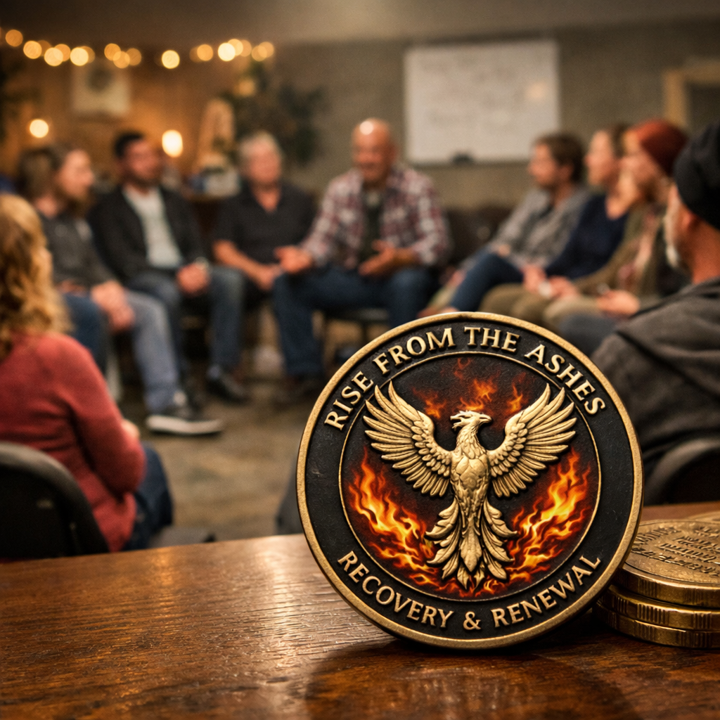 We closed the night by handing out coins with a phoenix rising from the ashes. A symbol as old as it is true: rebirth after destruction, life after collapse. On the back of each coin was the Serenity Prayer. Together we recited it, voices steady, some quiet, some strong, all united.